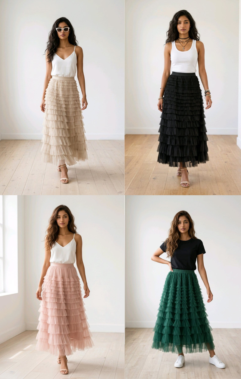 A Saia Midi de Tule S·Hanah Mode é a combinação perfeita entre romantismo e modernidade. Inspirada no universo da bailarina, ela traz camadas de tule leve e plissado que criam movimento e fluidez a cada passo. Com cintura alta elástica e ajuste confortável, valoriza a silhueta sem marcar, garantindo elegância e liberdade ao vestir. Seu comprimento midi até o tornozelo permite composições versáteis — do look casual com tênis ao visual sofisticado com salto. Uma peça delicada, feminina e cheia de presença, ideal para quem ama unir charme, conforto e estilo em qualquer ocasião. ✨